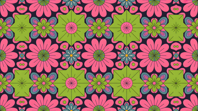 Floral geometric pattern with pink flowers and green shapes on dark background geometric pattern design| floral wallpaper |modern geometric flower seamless pattern