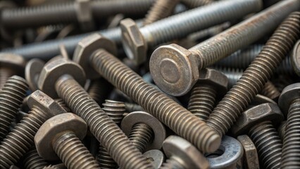 A closeup of threaded fasteners and bolts arranged in a chaotic their circular heads and linear shafts composing an abstract pattern of repetitive shapes and angles.