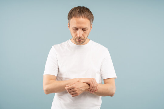 Sad man with wrist pain clutching hand in discomfort feels nerve compression. Sharp ache from excessive phone use scrolling, repetitive strain, joint inflammation, injury, tunnel syndrome, tendonitis.