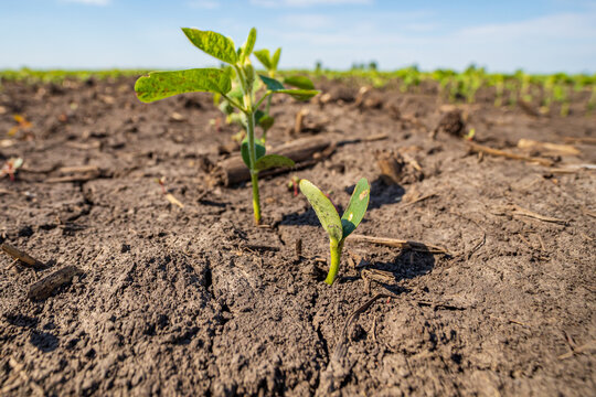 Replanted soybean plant emerging in farm field. Soybean farming, agriculture and planting season
