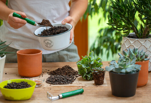 Woman is replanting a plant into a new brown pot. Many plants standing on a table.