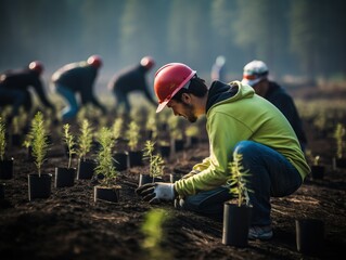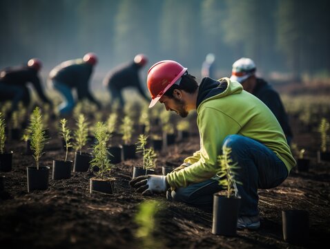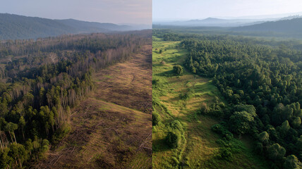 Before-and-after image of forest replanting, left side deforested, right side regrown and lush