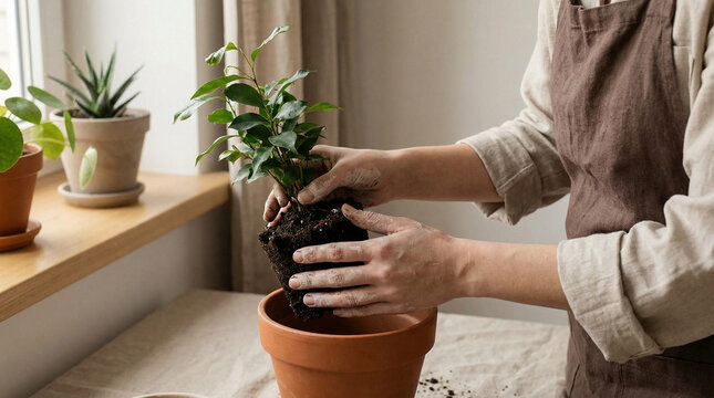 Indoor Garden Care — Planting and Green Living | Plant care | Beautiful, close-up composition of hands replanting a potted plant indoors