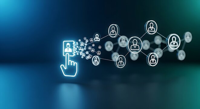 Scalability and business growth concept. A single holographic business icon, when touched, replicates into multiple icons, forming a growing network.