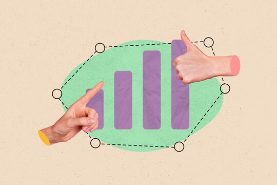 Photo collage artwork minimal picture of arm pointing finger startup idea graph showing thumb up isolated drawing background