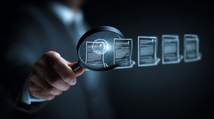Business team reviewing reports with augmented data overlay, collaboration and analytics