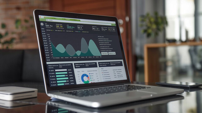 Collaborating over data visualization at bright office desk with laptop and printed reports