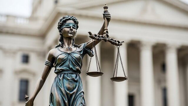 High-detail legal environment with wooden gavel in foreground, reflecting desk surface, surrounded by rich leather-bound books, subtle dust in light beams, and authoritative library atmosphere represe