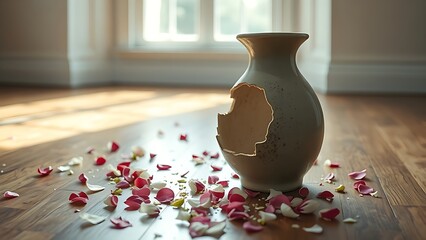 sedition. A shattered ceramic vase on a wooden floor with scattered flower petals in an empty room. wellbeing guides.