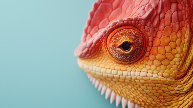 A close-up of a vibrant, multi-colored reptile showcasing its textured skin and prominent eye against a pastel background.