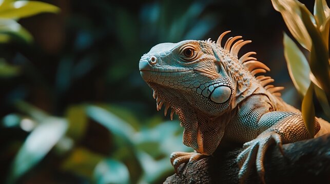 Close-up of a green iguana with a blurred background of green foliage.