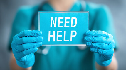 Medical staff holds 'NEED HELP' sign, requesting support & assistance. Urgency in healthcare. Support for those in distress. Access services