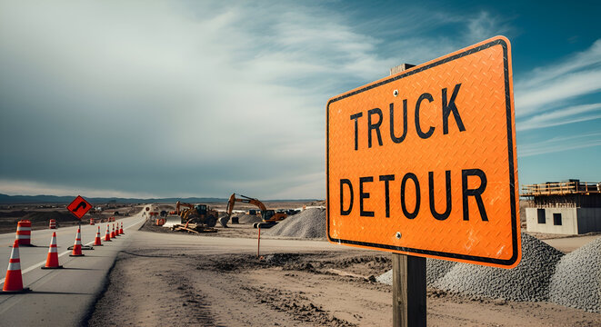 Truck Detour Sign At Highway Construction Site, Showing Directions for Traffic Flows