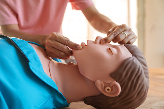 Close up view of hands performing chest compressions on cpr training dummy mannequin during course