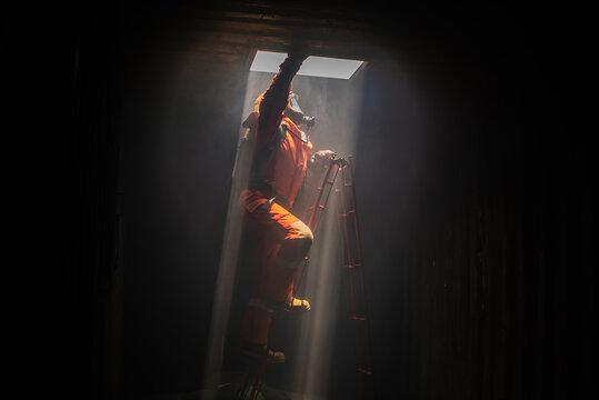 The firefighter is methodical in their approach ensuring safety at every step to save dummy of victim for practice.