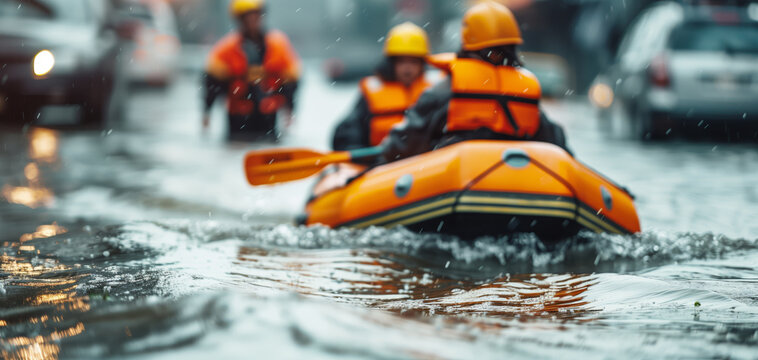 Rescue team evacuating cat on boat during flood. A cat sits at the prow of a yellow rescue boat manned by a team in safety gear amidst floodwaters