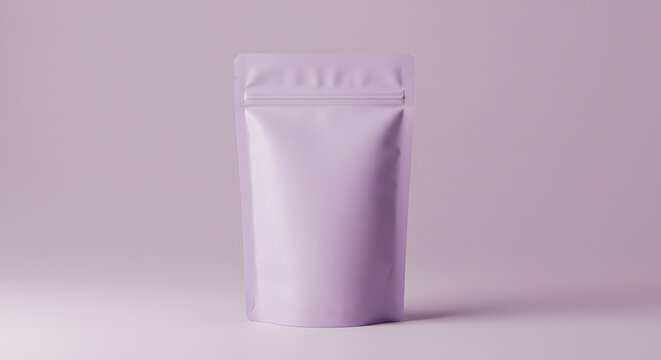 A single, plain, lavender-colored, resealable pouch,  isolated on a muted purple background.