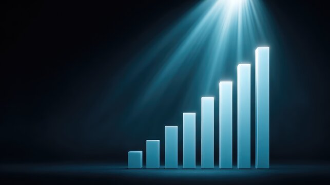Modern business growth visualization with ascending blue bars under dramatic spotlight showcasing success, progress, and achievement in a corporate environment