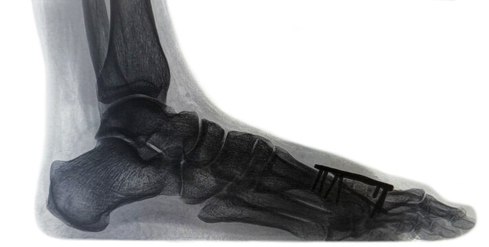 Xray image of Bone block distraction arthrodesis - MTP1 of the hallux metatarsophalangeal joint after resection arthroplasty. female foot after surgery - standing position with minimal load, pressure