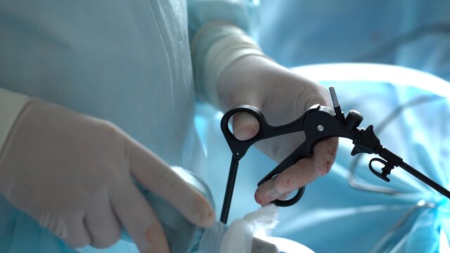 Operating room, team of surgeons performing laparoscopic intervention. Modern medicine, medical equipment in hospital. Laparoscope instruments. Doctors use endo-instruments and video cameras.