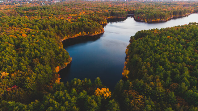 Aerial view of peaceful lake with geometric overlay art