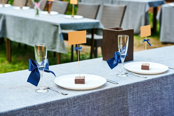 Table tent, reserved card sign empty blank on a wooden table, 3d illustration