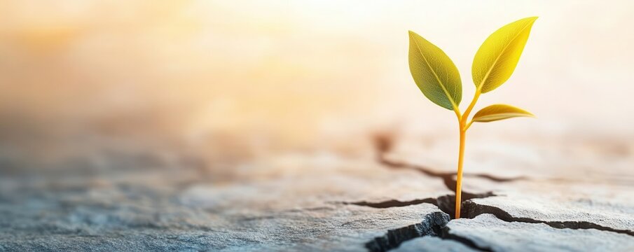 Green plant growing through concrete crack in urban environment