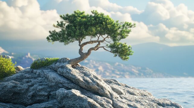 A beautiful resilient tree, small maritime pine growing on the rocky cliff with a beautiful seascape on background. Concept of tree fighting for life on a rock, hope and survival. Generative Ai.
