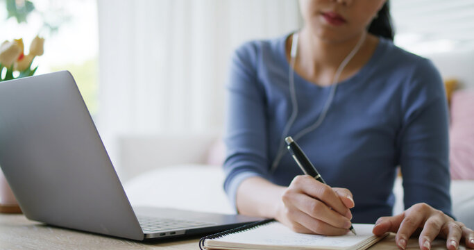 Work from home office young gen Z wfh concept relax sit easy at cozy desk write note think idea plan self MBA study reskill upskill
