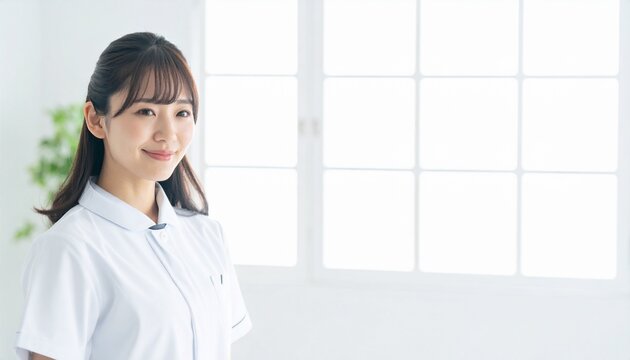 白い室内背景で微笑む若い日本人女性医療スタッフの看護師の写真	余白あり