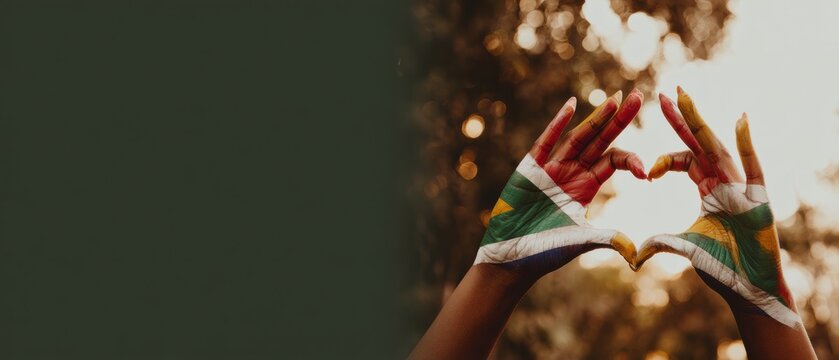 South African Liberation Day Heart Gesture with Flag Painted Hands Symbolizing Unity, Reconciliation, and National Healing in Social Cultural Trend