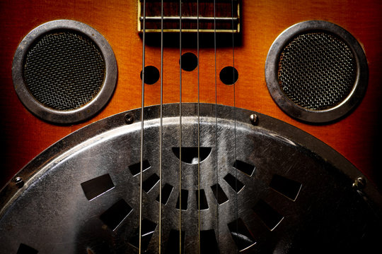 A vintage resonator guitar with a unique design, displayed on a white isolated background.