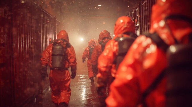 A dynamic scene of a training exercise where crew members simulate the handling of spent nuclear fuel demonstrating emergency response techniques and safety measures within a controlled