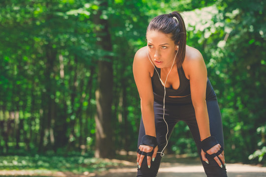 Smiling runner bending hands-on-knees pausing during neighborhood run wearing fitness watch