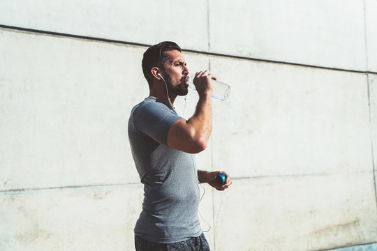 Sweaty Self-confident man runner Training Outdoors on stadium, tired runner, man on run for fitness exercise and marathon training cardio health workout.