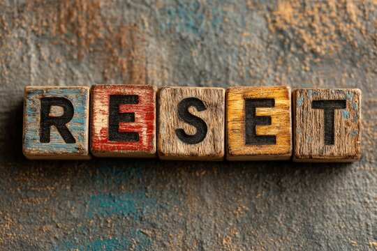 Reset: A tactile arrangement of lettered wooden blocks spells out RESET, symbolizing renewal and fresh starts, artfully displayed against a textured backdrop.