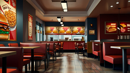 Fast food meal with burgers, fries, cookies and milkshake on red background
