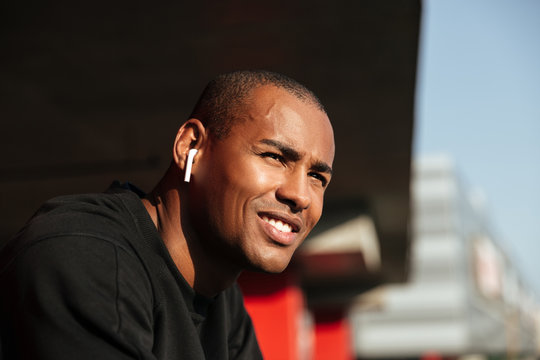 Sport fitness man relaxing listening to music after training outdoor in a city park . Young male athlete resting relaxing lying on grass after running and training exercise outside in summer.