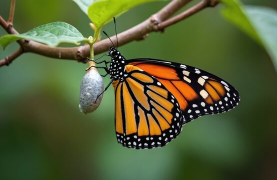 Close-up of monarch butterfly resting near cocoon. Orange, black wing colors. Insect, insect life cycle, transformation. Concept of nature, growth, change, evolution, new life. Macro photo with green