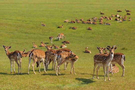 Red deer stag standing in tall grass with grazing herd in woodland meadow