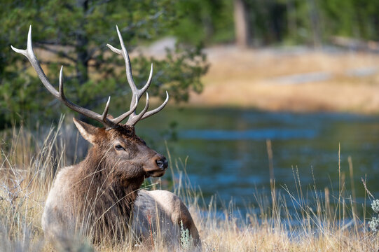 Bull elk resting with impressive antlers in autumn meadow north american wildlife