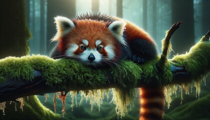 A detailed, close-up image of a red panda resting on a mossy branch with glistening dew drops on its fur.