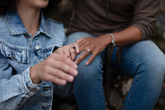 A woman rests her hand on her partner's knee, holding each other's hands. They are a queer, lesbian, and multiracial couple.