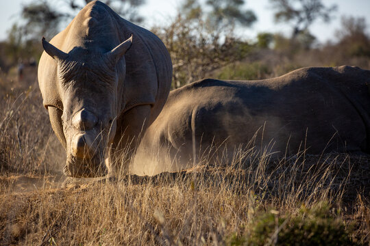 A rhino rests peacefully in a grassy field, bathed in the warm light.