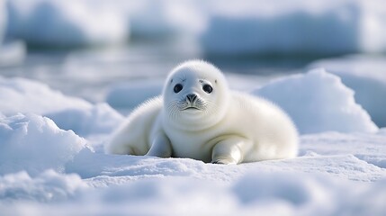 Majestic harp seal pup resting on an ice floe its fluffy white coat blending into the frozen landscape
