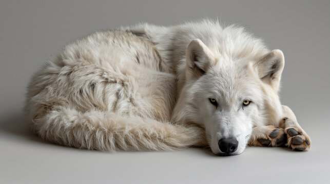 Wolf resting calmly on a white background