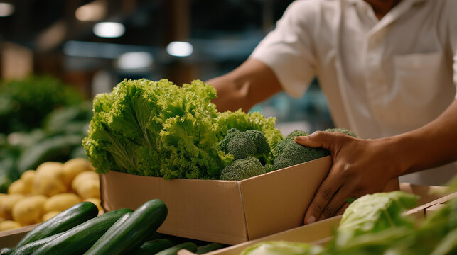 Food selection by a worker restocking fresh produce, ensuring healthy eating and food choice in a retail supermarket. Cardboard box nearby, paper label on vegetable, store aisle beeps.