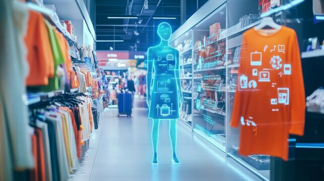Augmented reality mirror displaying virtual clothing choices on customer using interactive AI assistant. AI generated