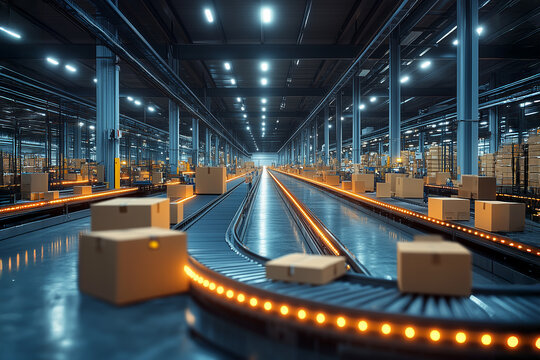 Autonomous robotic pickers navigating high-tech warehouse conveyor for automated logistics