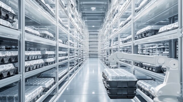 Autonomous robotic arms navigating massive warehouse aisles for automated fulfillment